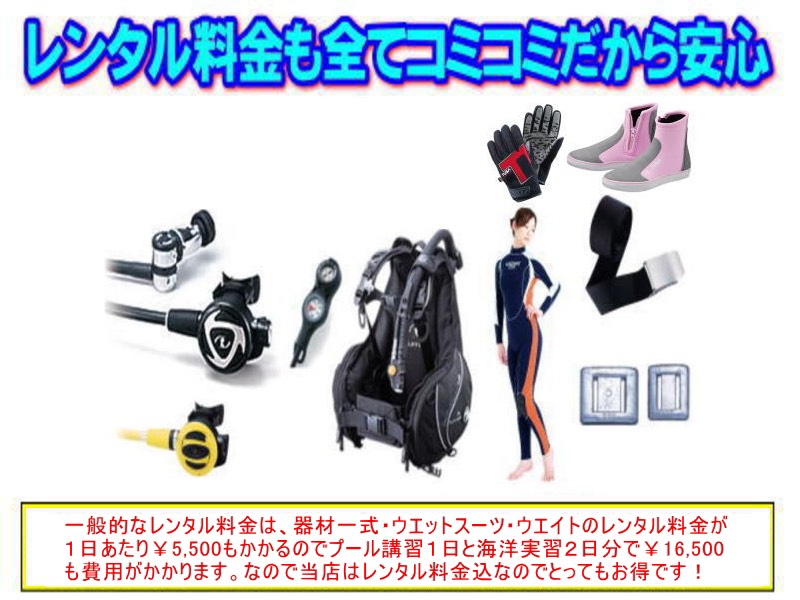 | ●指導料 ●各施設使用料 ●各実習費 ●漁協潜水整理券代 ●マニュアル(ダイブテーブル付き) ●申請料 ●トレーニングログと29ダイブ分のログ付ポケットログブック ●器材レンタル料 ●マスク、スノーケル、フィンの3点セットプレゼント料 ●スーツレンタル料 ●タンク・ウエイトレンタル料 ●宿泊代(夕朝食付き) ●無料送迎 ※宿泊は男女別室で他のお客様で同性の方がいる場合は2~4名1室となります |